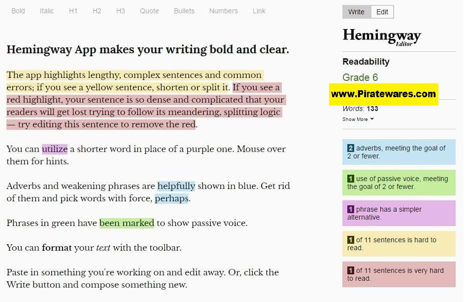 If you’re looking for a single program to handle bold, italics, headings, and bullets, go no further than Hemingway Editor Crack Wordy sentences can be highlighted in yellow, and the most aggravating ones in red. Text from Microsoft Word (.docx) files can also be imported. It may evaluate your writing thoroughly, taking into account elements like sentence length and complexity, and then provide you with a readability score. A Word Count utility that provides precise word counts is also provided by the software. You can also include the use of adverbs, passive voice, and other elements that might improve or hinder your text’s readability.