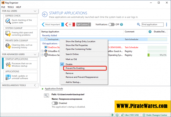 • Using the key for the full version of Reg Organizer, you can inspect, modify, or disable such programs.
